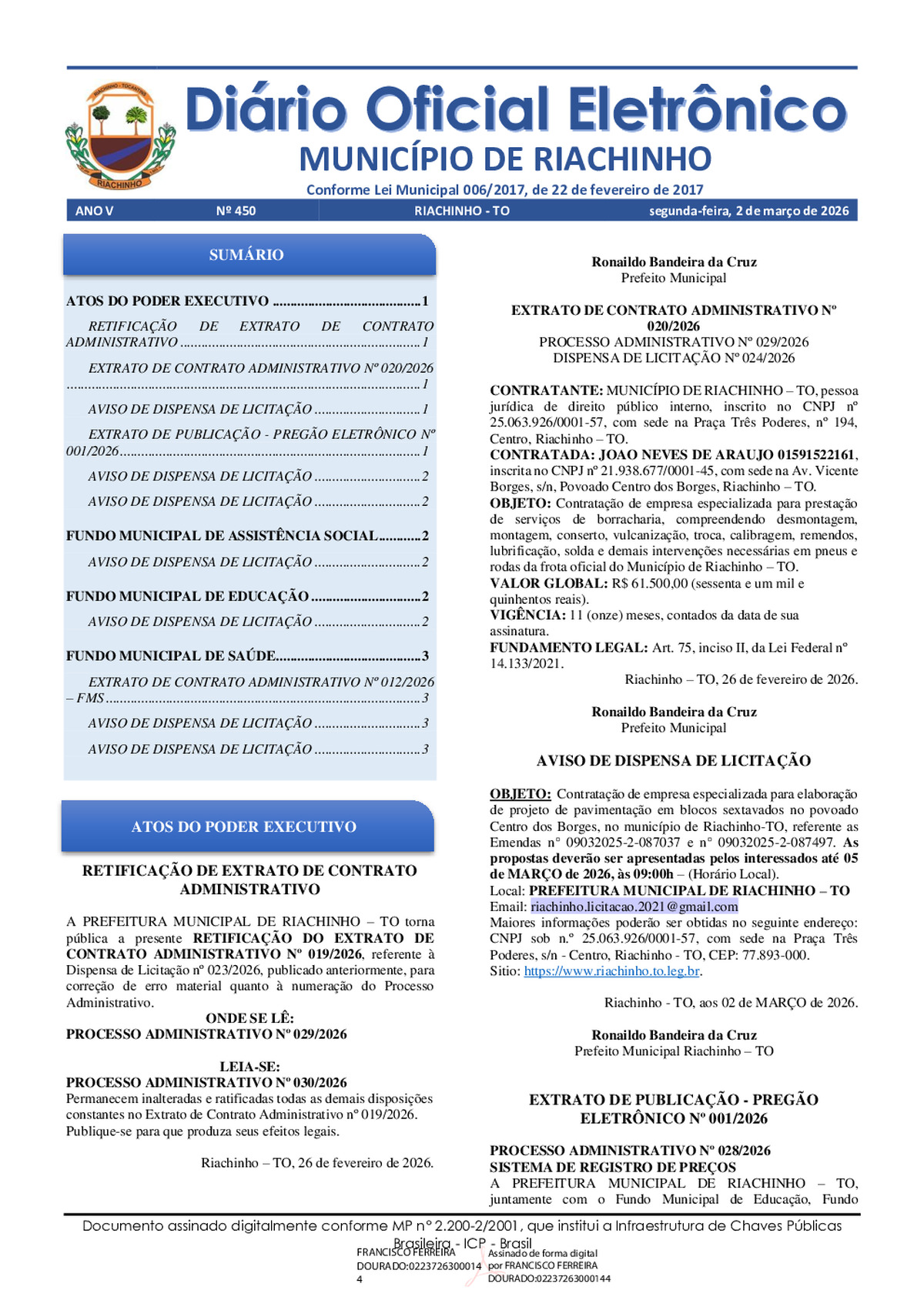 ESTIMA A RECEITA E FIXA A DESPESA DO MUNICIPIO DE RIACHINHO - TO, ESTABELECENDO O PROGRAMA DE TRABALHO PARA O EXERCICIO FINANCEIRO DE 2026 E DÁ OUTRAS PROVIDENCIAS.